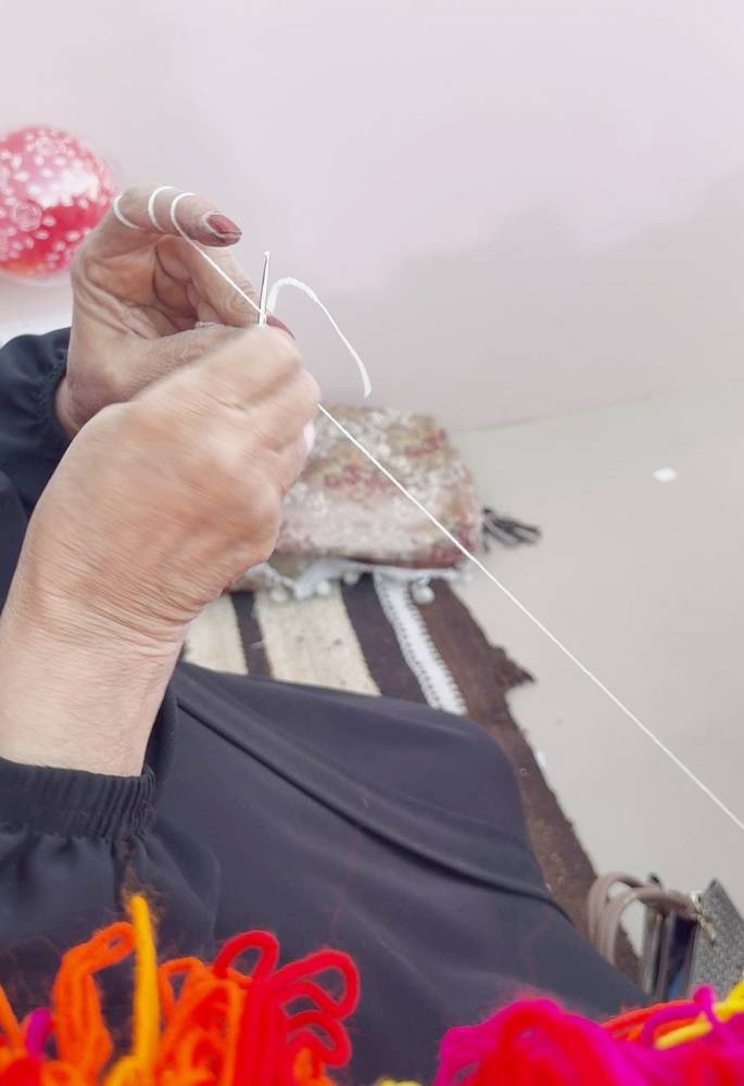 بيدين بدت عليهما آثار الزمن.. الحرفية «أم أحمد» تحاول التقاط ثقب الإبرة والخيط، على هامش مشاركتها بالملتقى العالمي للورد والنباتات العطرية، وتبدي قلقها من عدم اهتمام الجيل الجديد بالحرف اليدوية، طالبةً منهم المحافظة عليها، وأثنت على جهود جناح هيئة التراث المشارك في الملتقى للتعريف بالموروث الأصيل. وعن إقبال الزوار للجناح قالت: رائع، وتضيف، أنها لن تترك الحرفة التي عشقتها منذ 30 عاماً في سبيل الاهتمام بتراث الآباء والأجيال والمحافظة عليه وتعريف الأجيال به، ووجدت فيه ما يبعد الملل ويملأ الفراغ. وأثنت أم أحمد على دعم هيئة التراث للحرفيين والحرفيّات، وتقول إنها شاركت في مهرجانات عدة، وما تقوم بحياكته اليوم عبارة عن تلبيسات للفناجين، و«التعليقات» و«الشنف»أما الحرفية أم خالد فقالت: «إنها تمتهن حياكة السدو كالفرش والقواطع القديمة بين البيوت، ولها في هذه الحِرفة أكثر من 45 عاماً»، وفي رأيها أن أكثر المناطق طلباً لمشغولات السّدو هي الرياض.من جانبها، كشفت الرسامة (المهرة)، أنها تُعِد اللوحات بشكل يدمج بين التراث القديم والتراث المعاصر، ومنها لوحة (بنت التأسيس) التي صممتها بالمشغولات التراثية من خيوط وملابس قديمة، لتظهر الفتاه المشاركة في يوم التأسيس بما كانت ترتديه الجدات والأمّهات، أما (لوحة العطاء) فعبارة عن جذع النخلة الناشف، والسعف الأخضر لإبراز النماء والعطاء المستمر، كما تم خرز التمر بالكريستالات الجميلة لرمزيته الثمينة، وتضيف، أنها تسعى بعد تقاعدها من التعليم للانشغال بالحرف اليدوية المعاصرة. ومن لوحاتها واحدة تعبّر عن نجد، تُمثّل فيها حرارة الشمس والبيوت النجدية بمعالمها وتفاصيلها، إضافة لِـ«علوّ النخيل» الذي يبرز شموخ وعطاء شعب طويق العظيم.المهرة: التراث المعاصر يدخل البيوتأم خالد: الرياض الأكثر طلباً للسدو