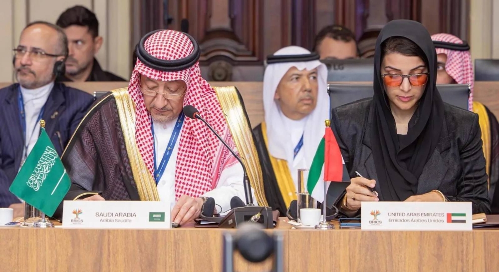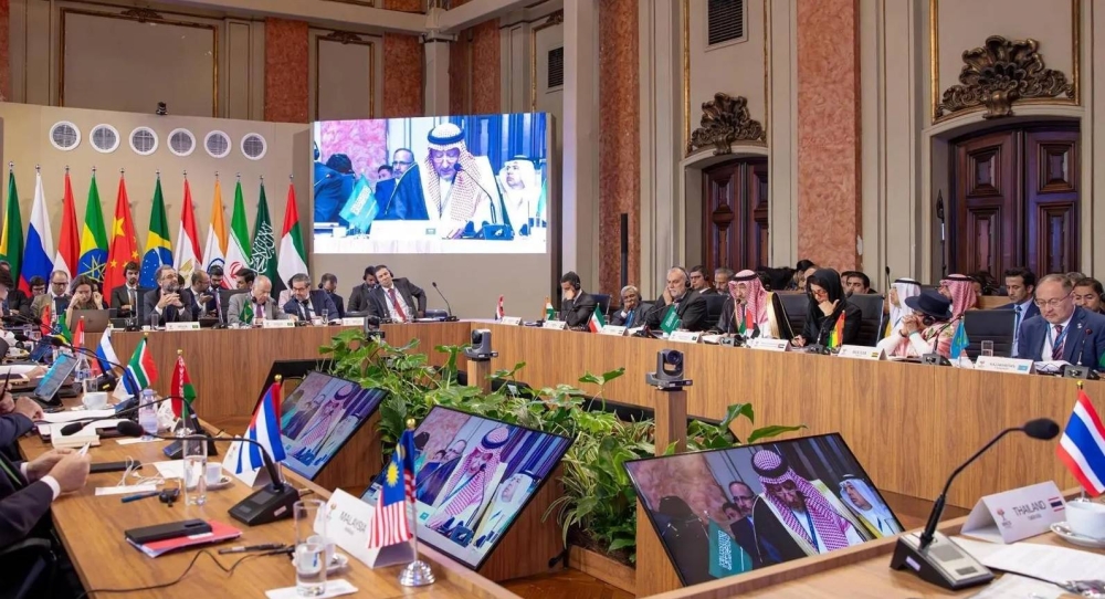 وأعرب عن تطلع المملكة إلى تعزيز عمل مجموعة البريكس والمجتمع الدولي ككل بالقيام بدور فاعل في حل الأزمات المتصاعدة وتخفيف التوترات، مؤكداً أن المملكة تواصل قيادة الجهود من خلال اللجنة الوزارية المنبثقة عن القمة العربية الإسلامية المشتركة الاستثنائية والتحالف الدولي لتنفيذ حل الدولتين، لحشد الدعم الدولي تجاه وقف العنف وحماية المدنيين وضمان وصول المساعدات الإنسانية إلى المناطق الفلسطينية المتضررة، والمضي قدماً بحل الدولتين باعتباره السبيل الوحيد لتحقيق السلام والأمن الدائمين للجميع.