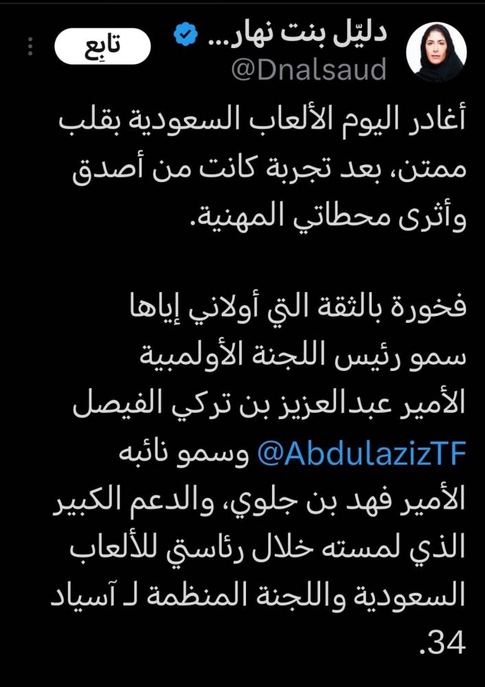 وقالت الأميرة دليل عبر حسابها على منصة التواصل الاجتماعي «X»: «أغادر اليوم الألعاب السعودية بقلب ممتن، بعد تجربة كانت من أصدق وأثرى محطاتي المهنية. فخورة بالثقة التي أولاني إياها رئيس اللجنة الأولمبية الأمير عبدالعزيز بن تركي الفيصل، ونائبه الأمير فهد بن جلوي، والدعم الكبير الذي لمسته خلال رئاستي للألعاب السعودية واللجنة المنظمة لـ»آسياد 34«، حيث تشرفت بالعمل مع فريق وطني مخلص ومتفانٍ، نجحنا سوياً في بناء منصة رياضية نفتخر بها، ونمضي بخطى واثقة لتحقيق أهداف رؤية السعودية 2030. الرياضة كانت وما زالت شغفي الأول، وسأستمر بإذن الله بخدمة هذا القطاع من أي موقع أكون فيه».