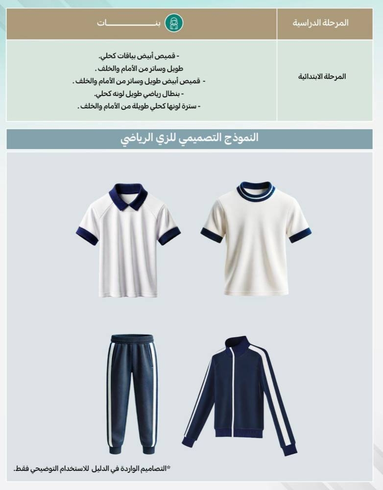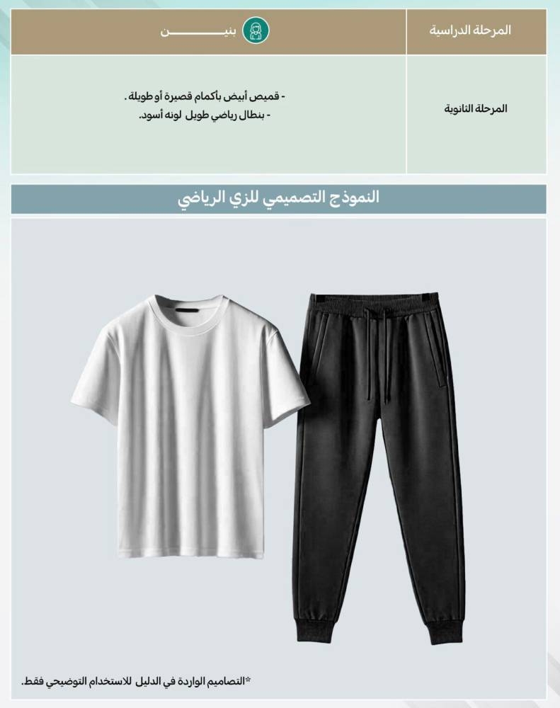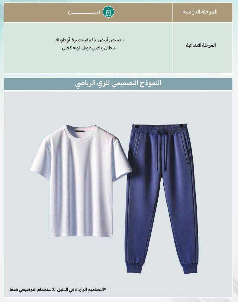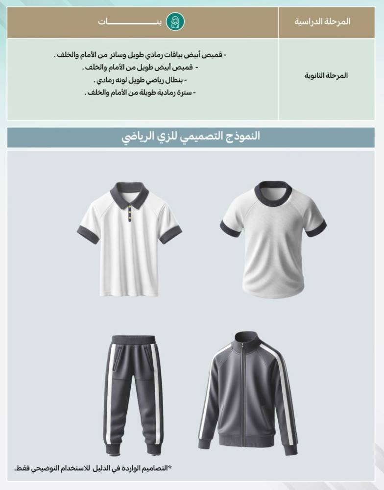 وبيّن الدليل الزي الرياضي لباقي المراحل الدراسية، فيرتدي طلاب الابتدائية قميصاً أبيض بأكمام قصيرة أو طويلة، وبنطالاً رياضياً طويلاً لونه كحلي، فيما ترتدي المرحلة المتوسطة قميصاً أبيض بأكمام قصيرة أو طويلة، وبنطالاً رياضياً طويلاً لونه أخضر زيتي، والثانوية قميصًا أبيض بأكمام قصيرة أو طويلة، وبنطالاً رياضياً طويلاً لونه أسود.
