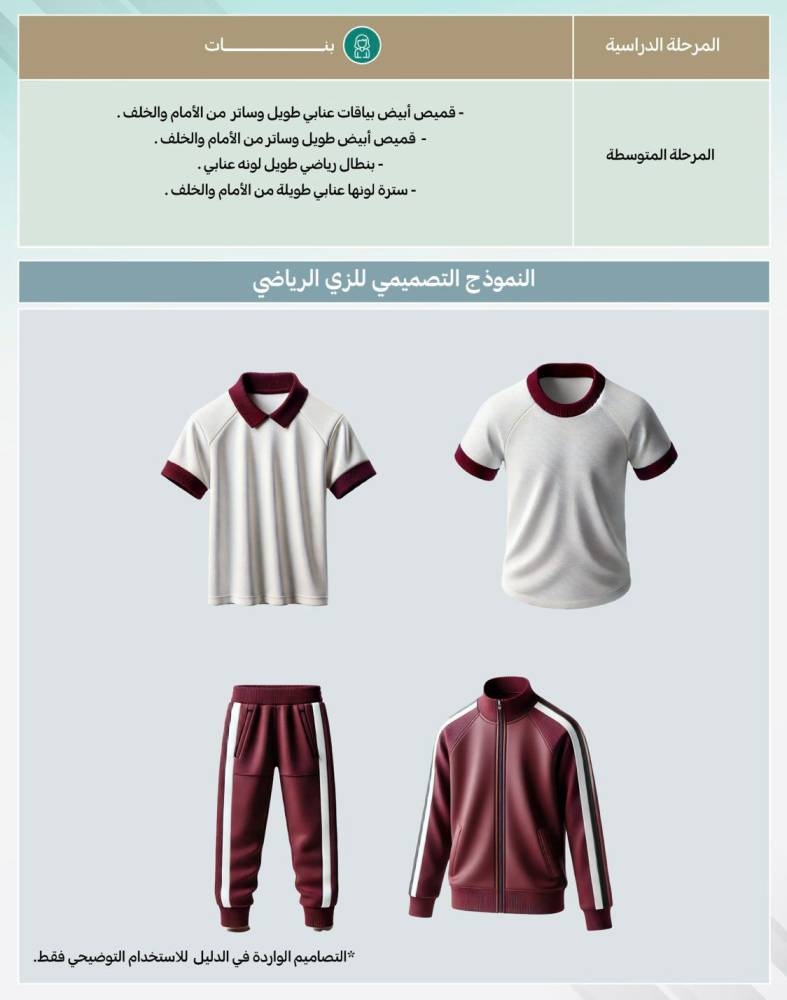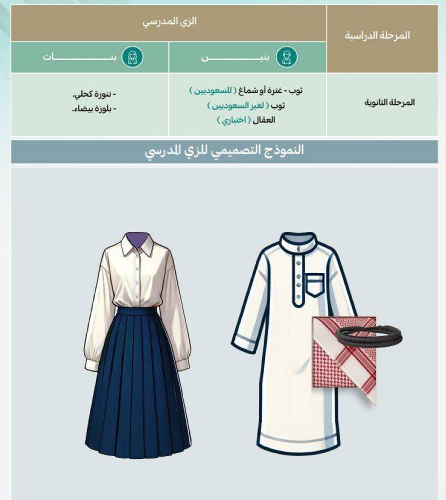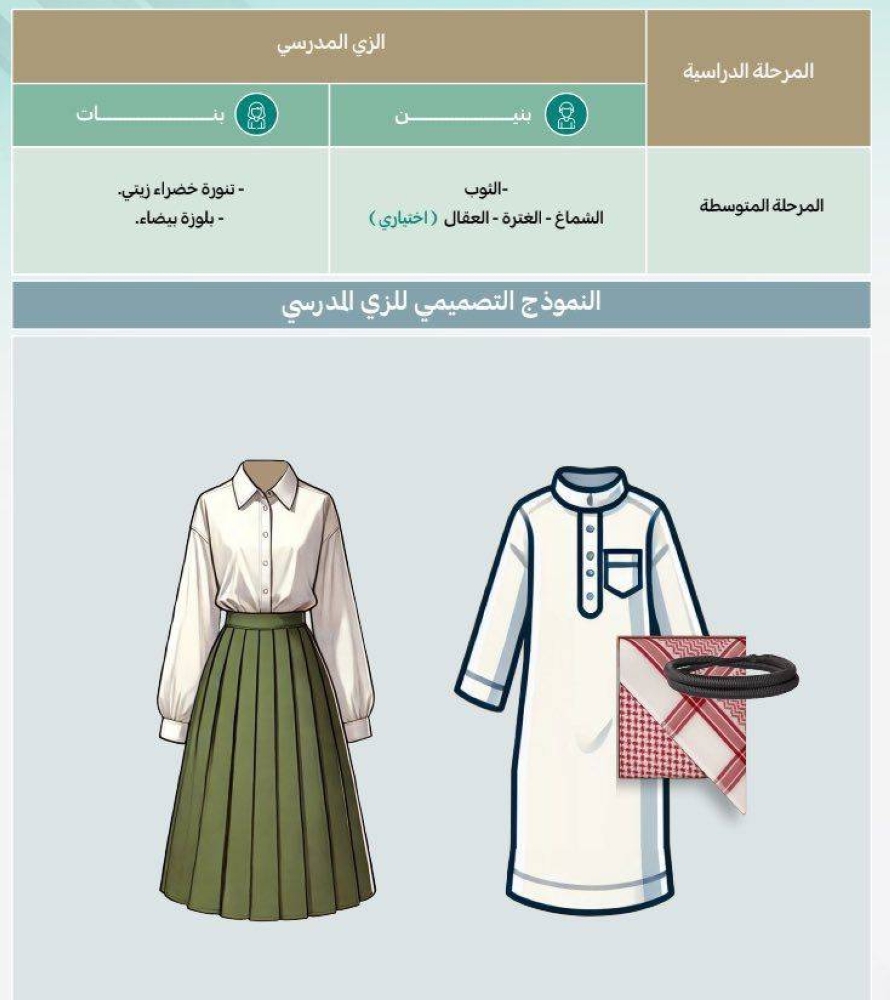 وحدد الدليل الزي الخاص بالمرحلة المتوسطة للبنين الثوب والشماغ أو الغترة، والعقال (اختياري)، فيما ترتدي البنات تنورة خضراء زيتية وبلوزة بيضاء، وفي المرحلة الثانوية للبنين الثوب والغترة أو الشماغ، والعقال (اختياري)، للسعوديين، والثوب لغير السعوديين، فيما ترتدي البنات تنورة كحلية وبلوزة بيضاء.
