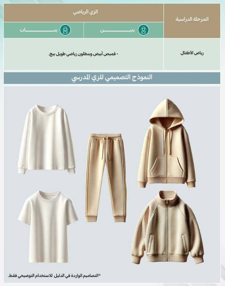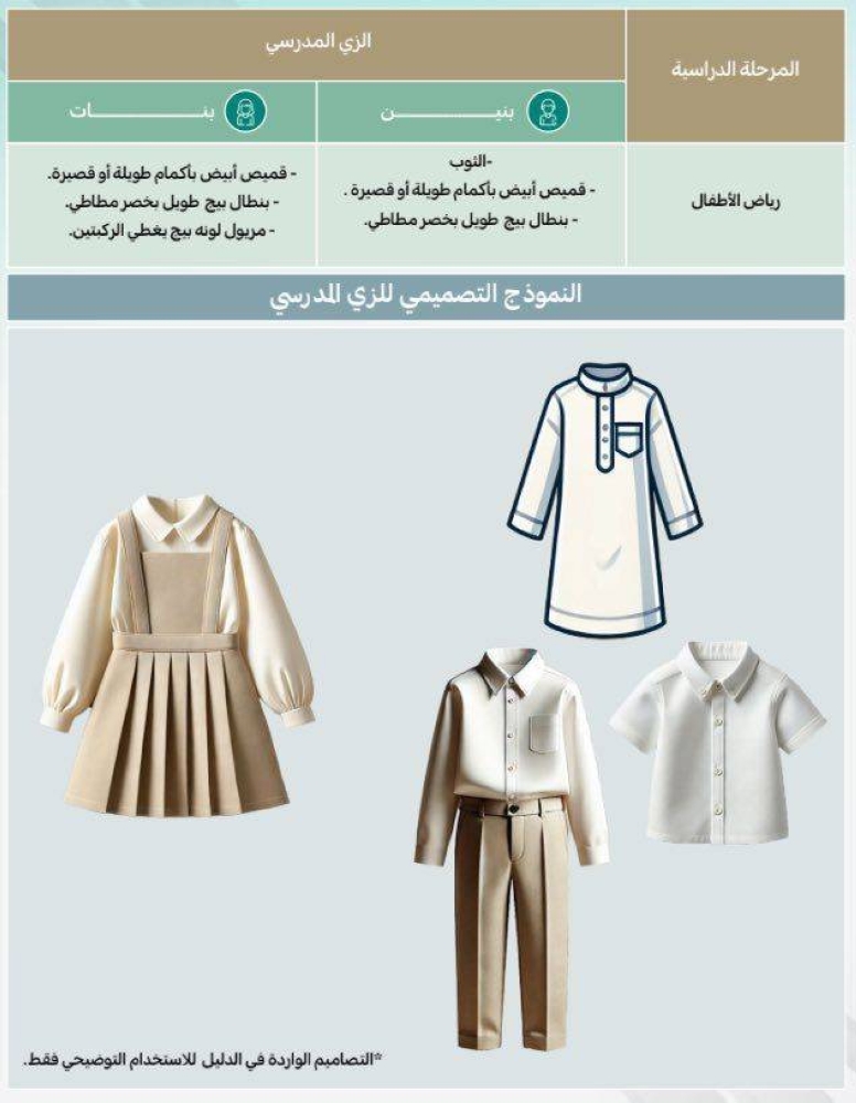 ونصّ الدليل على ارتداء البنين في مرحلة رياض الأطفال، ثوباً أو قميصاً أبيض بأكمام طويلة أو قصيرة أو بنطالاً طويلاً (اللون بيج) بخصر مطاطي، فيما ترتدي البنات قميصاً أبيض بأكمام طويلة أو قصيرة أو بنطالاً طويلاً (اللون بيج) بخصر مطاطي أو مريولاً (اللون بيج) يغطي الركبتين.