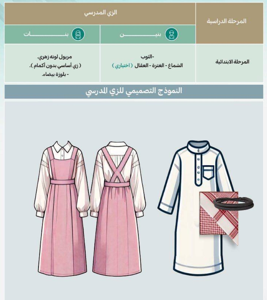 ووفق الدليل الذي اطلعت عليه «عكاظ» يُعد الزي المعتمد الثوب والشماغ أو الغترة، والعقال (اختياري)، للبنين في المرحلة الابتدائية، وترتدي البنات في هذه المرحلة مريولاً زهرياً وبلوزة بيضاء.