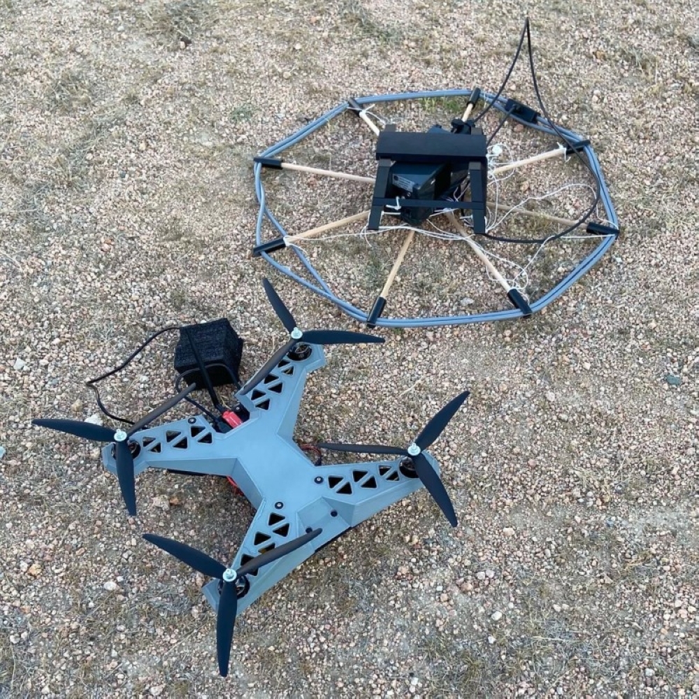 الدرون مجهّز بهيكل مطبوع ثلاثي الأبعاد باستخدام مادة البوليمر، ويحتوي على تقنيات استشعار للكشف عن المعادن تحت الأرض باستخدام تقنية النبضات الكهرومغناطيسية (PI).