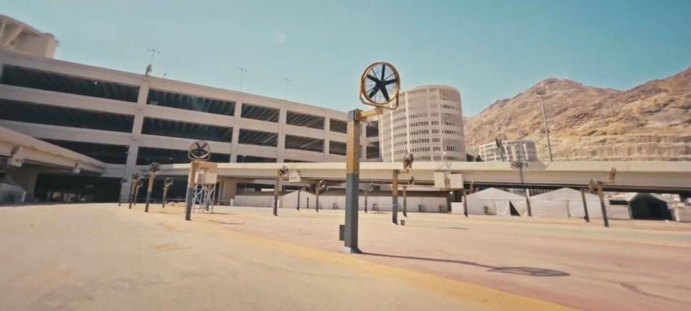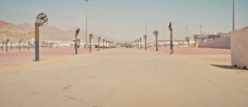 The eastern plazas of the Jamaraat facility have witnessed the installation of 200 mist fans to cool the areas during the Hajj season. These fans are the latest in engineering and have a high thrust power using (air cooling by mist) technology by absorbing thermal energy from the outside air to reduce the temperature. Mist fans and fog columns are used to cool the air in open spaces, as water is pumped under high pressure by a high-pressure pump (not less than 42 kg/cm²) into special high-pressure pipes where ultra-fine nozzles (ranging from 2 to 1 micron) distribute the water in the form of cold mist (thousands of cold water droplets) to absorb thermal energy from the outside air and lower its temperature.