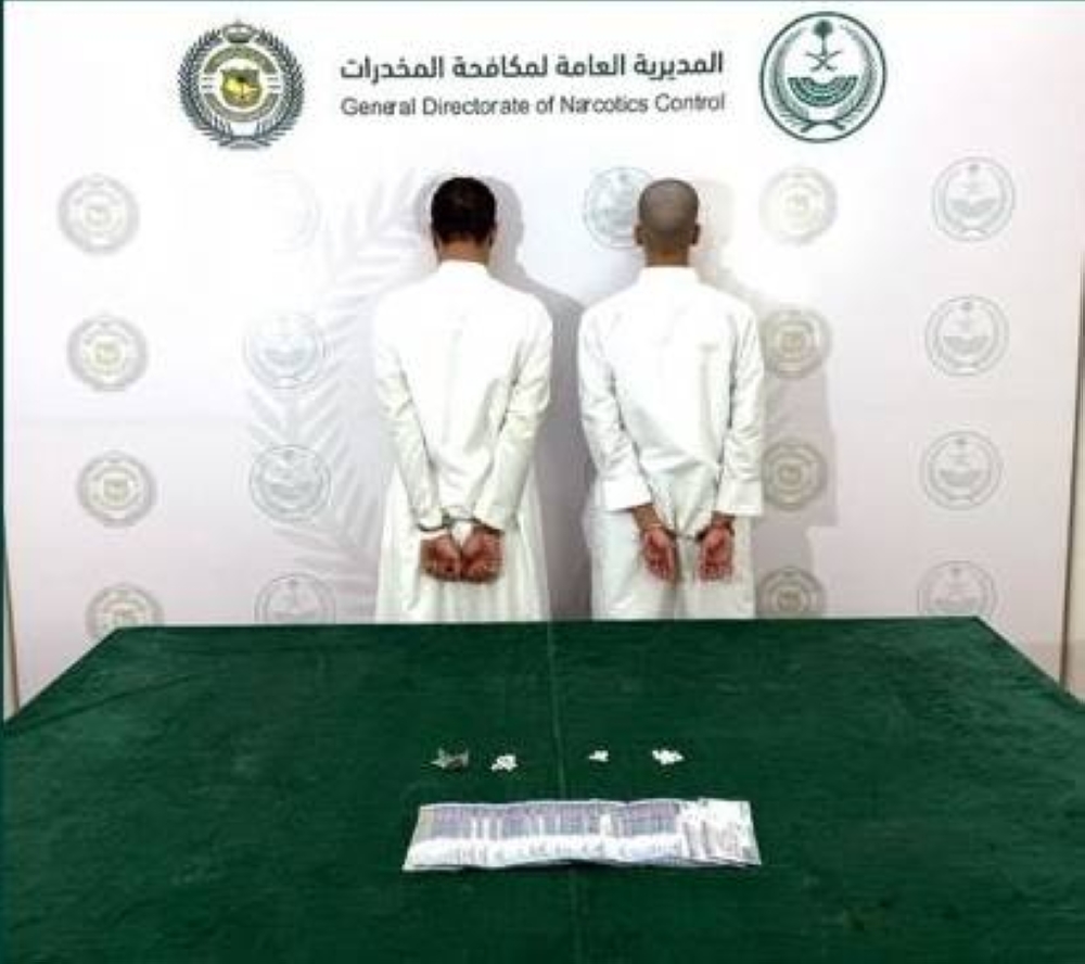 The General Directorate for Drug Control arrested two citizens in the Mahd al-Dhahab Governorate for promoting the narcotic substances of hashish and amphetamines, as well as pills subject to medical trading regulations. They were detained, and legal procedures were taken against them, and they were referred to the Public Prosecution.