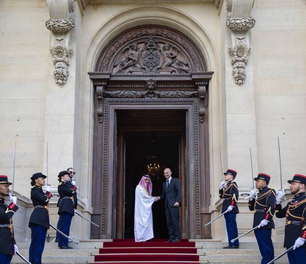 As part of the efforts of the ministerial committee tasked by the extraordinary joint Arab Islamic summit regarding the developments in the Gaza Strip, a delegation from the ministerial committee, headed by Minister of Foreign Affairs Prince Faisal bin Farhan bin Abdullah, Deputy Prime Minister and Minister of Foreign Affairs and Expatriates of the Hashemite Kingdom of Jordan Ayman Safadi, and Minister of Foreign Affairs, Immigration, and Egyptians Abroad of the Arab Republic of Egypt Dr. Badr Abdelatty, held a meeting today with the Minister of Europe and Foreign Affairs of the French Republic Jean-Yves Le Drian, at the headquarters of the French Ministry of Foreign Affairs in the capital, Paris.