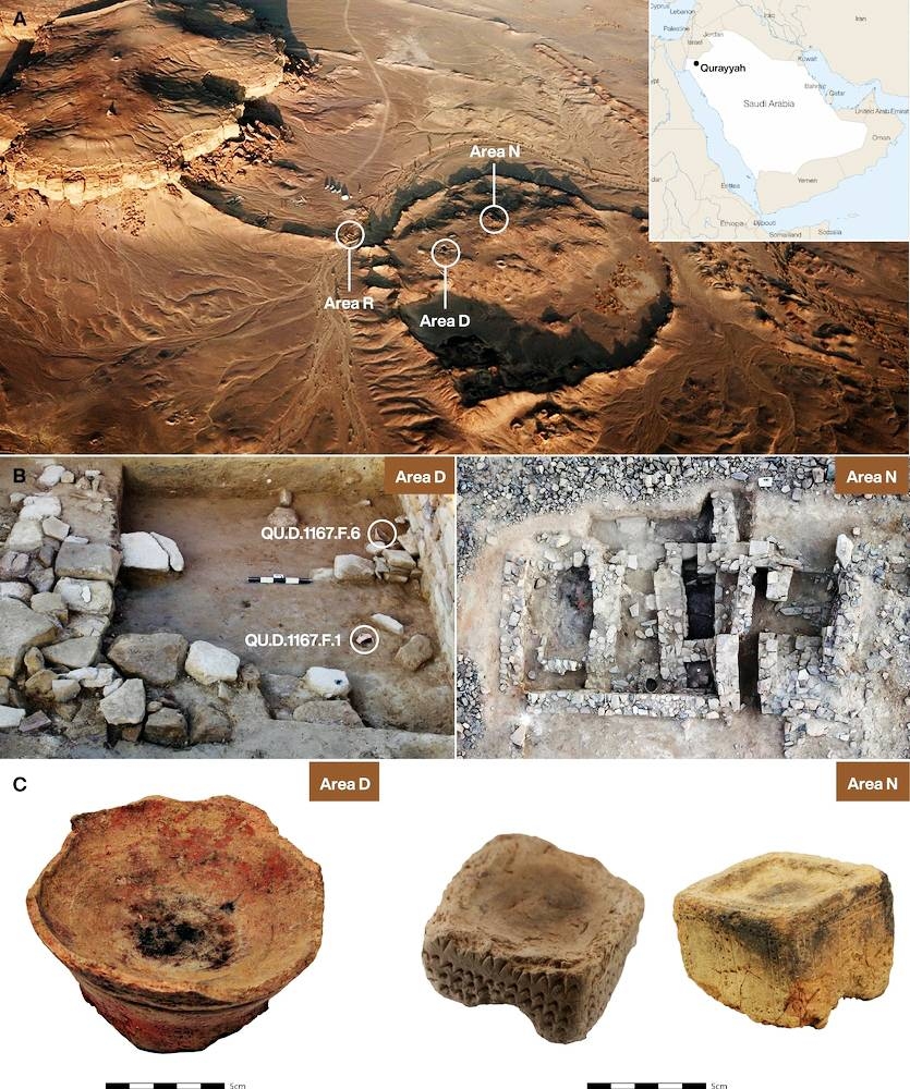 ويقع الموقع في واحة «قُرَيّة» التابعة لمنطقة تبوك، وهو أحد أهم المواقع الأثرية المرتبطة بالعصر الحديدي، إذ عثر خلال أعمال التنقيب على مبخرات فخارية تحتوي على بقايا عضوية، خضعت لتحليل علمي متقدم باستخدام تقنيات التحليل الطيفي الكتلي. وكشف التحليل وجود مركبات الهارمين والهارمان، وهي قلويدات معروفة بارتباطها بنبات الحرمل، الذي يُستخدم حتى اليوم في التبخير الشعبي والطقوس العلاجية في المنطقة.