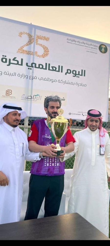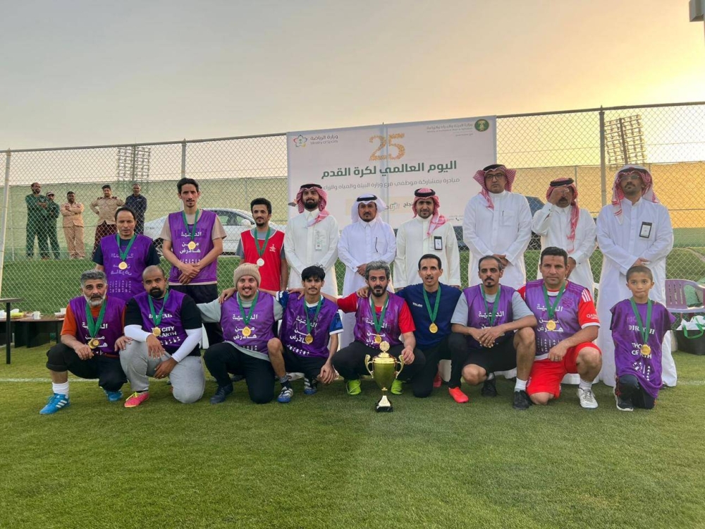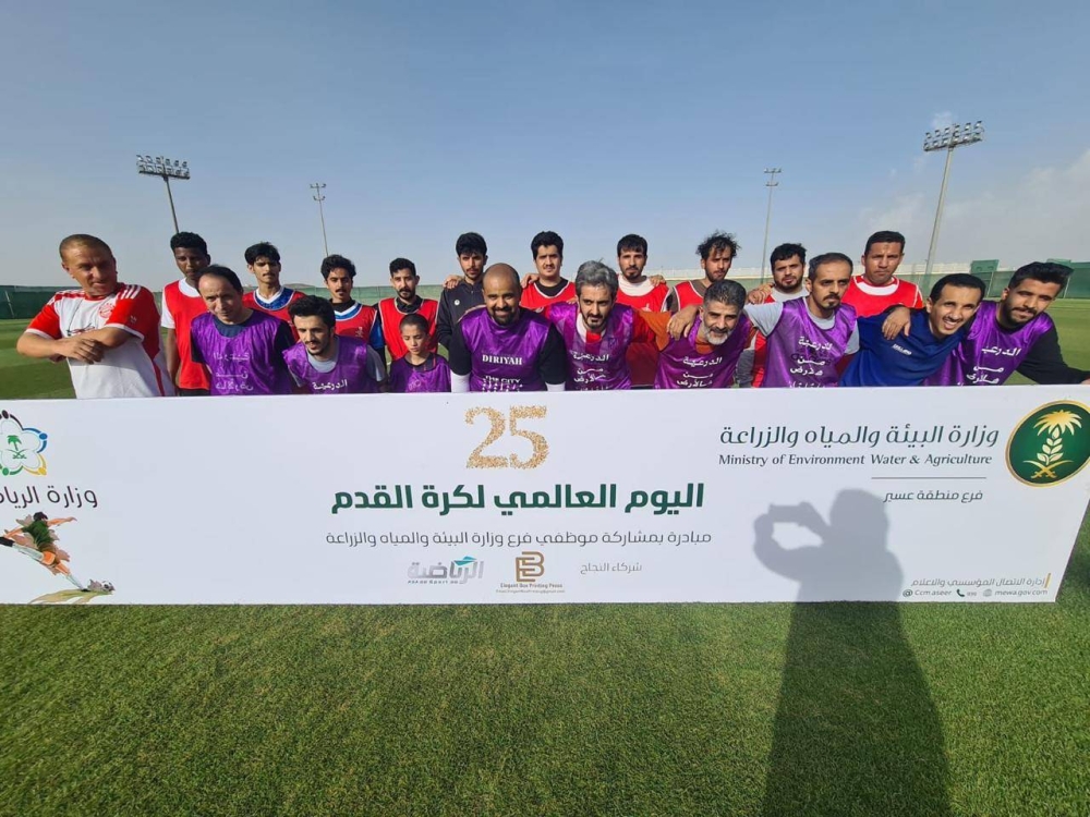The branch of the Ministry of Environment, Water, and Agriculture in the Asir region, represented by the Institutional Communication and Media Department in partnership with the branch of the Ministry of Sports in the region, held an event for the World Football Day at the Prince Sultan bin Abdulaziz Sports City Stadium. The event aimed to engage employees, promote sports practice, and increase the number of practitioners as a first step for upcoming initiatives. This initiative is considered the first of its kind at the national level and was organized through self-efforts from both parties, with a financial cost for this event being "zero".