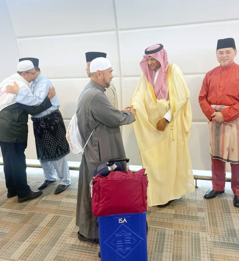 The Ambassador of the Custodian of the Two Holy Mosques to Brunei Darussalam, Mohammed Abdullah Al-Braithen, welcomed the Bruneian pilgrims arriving from the holy sites after performing the Hajj at Brunei International Airport in the capital, Bandar Seri Begawan, in the presence of several officials.