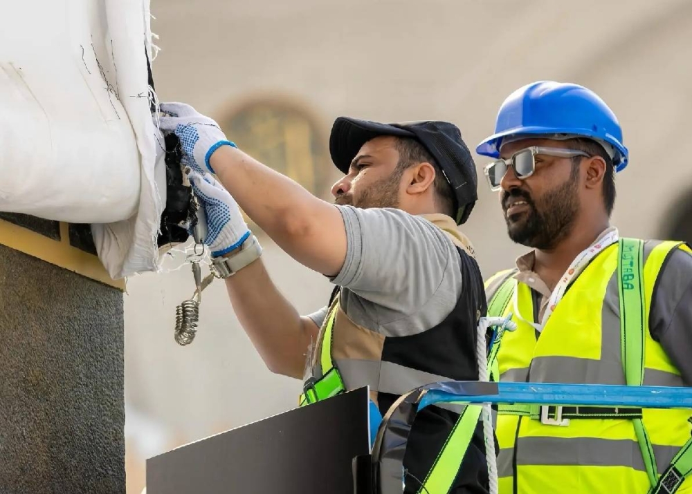 A specialized, trained, and academically and practically qualified Saudi team supervises the dismantling and changing of the main Kiswah, which includes raising the old Kiswah, removing the gold embroidery, and draping the new Kiswah.
