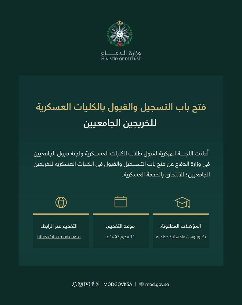 The Ministry of Defense revealed that the required qualifications for registration are: Bachelor's, Master's, and Doctorate degrees, noting that the application period begins on the 11th of Muharram 1447 via the link: http://afca.mod.gov.sa.