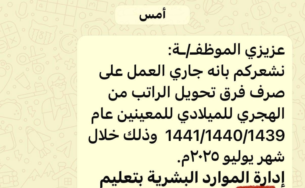 The education administrations in the regions and governorates have notified their employees who are eligible for the payment of the differences in salary conversion from the Hijri calendar to the Gregorian calendar, whose entitlements were affected by the transition, that the payment process is underway during the current month of July. According to sources from "Okaz," the eligible individuals are those appointed during the years 1439, 1440, and 1441 Hijri. The notification states: "Dear employee: We inform you that work is ongoing to disburse the difference in salary conversion from Hijri to Gregorian for those appointed in the years 1441/1440/1439." "Okaz" had previously reported the directive from the Minister of Education, Yusuf Al-Bunyan, to expedite the payment of salary differences resulting from the transition for those whose entitlements were affected within the ministry, with the data to be reviewed and payments made within 30 working days. It is noted that the start of salary payments according to the Gregorian calendar began on the 19th of Rabee' Al-Akhir 1439 Hijri, based on the royal directive to unify the payment dates for state employees' salaries on the 27th of each Gregorian month, and to unify the service bill dates in the week following the payment.