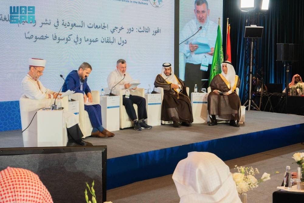 The first session was titled "The Efforts of Graduates in Clarifying the Correct Islamic Creed and Promoting the Method of Moderation and Balance," chaired by Dr. Ahmed bin Salem Al-Amri, the President of Imam Muhammad bin Saud Islamic University, with the participation of several academics and graduates. The session opened with a speech by the head of the Sharia Research Center at Imam University, Dr. Mohammed bin Hassan Al-Sheikh, who reviewed the importance of instilling the values of moderation and balance, followed by several scientific papers presented by Dr. Fatmir Ghani Zaimi, Dr. Bali Muslih Sadiq, and Dr. Ismail Baradhoushi. The second session was chaired by the Ambassador of the Custodian of the Two Holy Mosques to the Republic of Albania, Faisal bin Ghazi Hafzi, titled "Enhancing the Role of Graduates in Teaching and Spreading the Arabic Language," with the participation of several academics and graduates from the Balkan countries. The session was opened by the head of the College of Da'wah and Fundamentals of Religion at Umm Al-Qura University, Dr. Abdullah bin Musa Al-Kathiri, followed by scientific papers presented by a group of academics addressing the role of graduates in enhancing Arabic language education and the associated challenges.