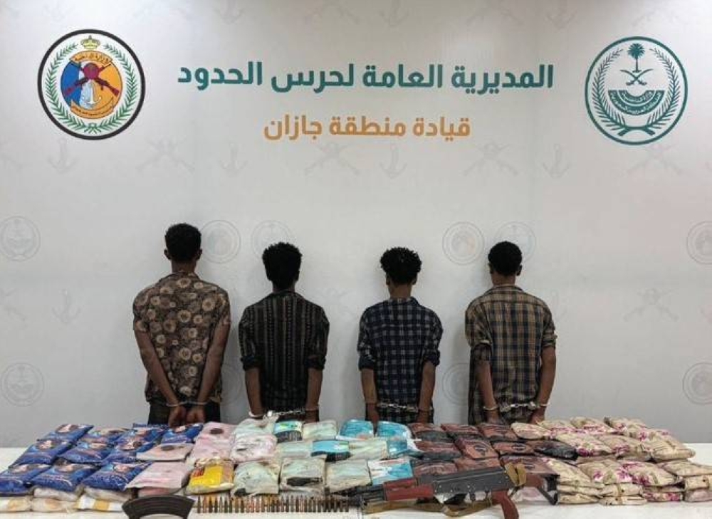 The border patrols of the Border Guard in the Al-Aridah sector of the Jazan region arrested 4 violators of the border security system of Ethiopian nationality for smuggling 178.7 kilograms of hashish. The initial legal procedures against them were completed, and they, along with the seized items, were handed over to the relevant authorities.