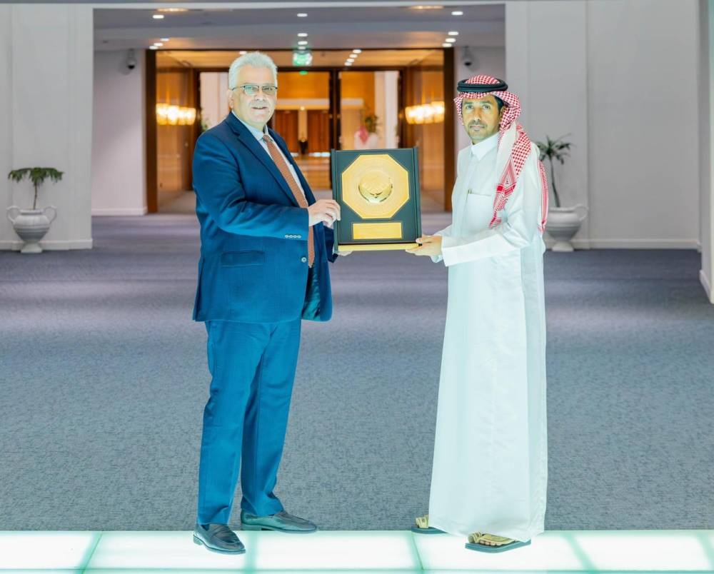 At the end of the visit, Secretary-General Dr. Mansour Al-Shammari presented the "I'tidal" shield as a commemorative gift to the Palestinian ambassador, Engineer Mazen Ghanem.