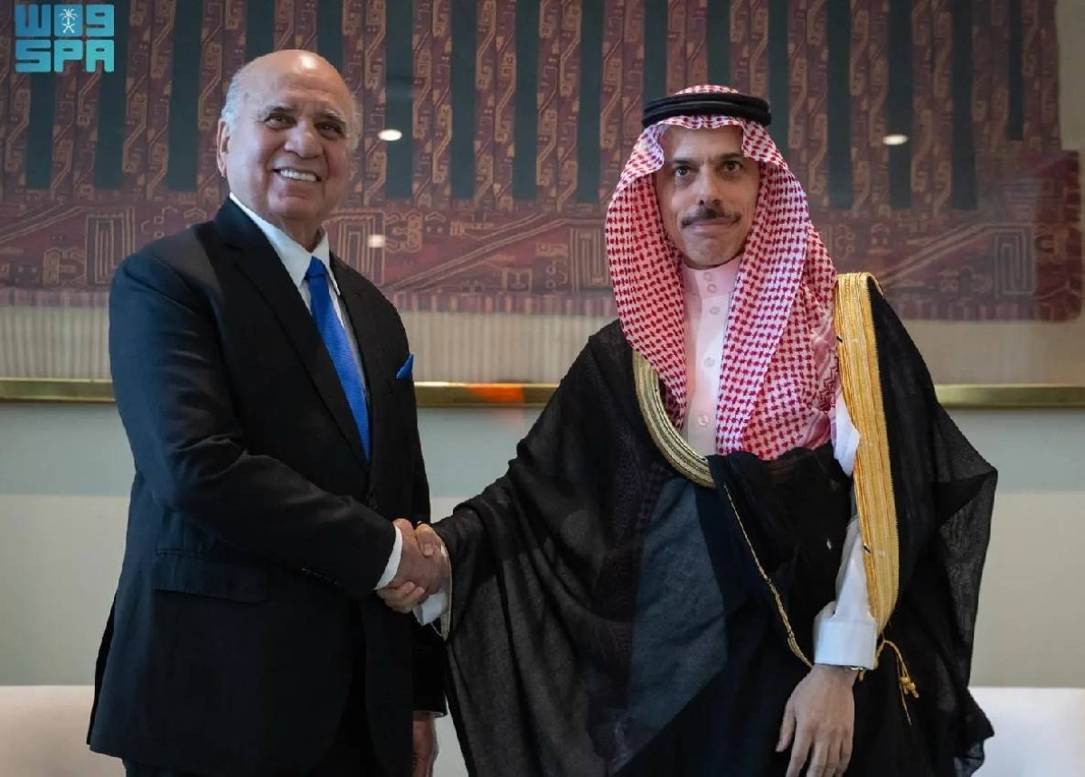 The Minister of Foreign Affairs, Prince Faisal bin Farhan bin Abdullah, met today at the United Nations headquarters in New York with the Deputy Prime Minister and Minister of Foreign Affairs of the Republic of Iraq, Dr. Fouad Mohammed Hussein, on the sidelines of the high-level international conference on the peaceful settlement of the Palestinian issue and the implementation of the two-state solution at the ministerial level, which was chaired by the Kingdom in partnership with the French Republic.