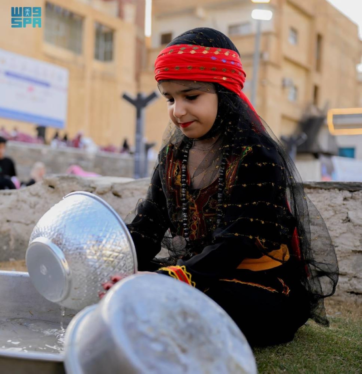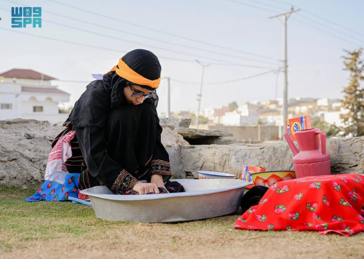 Through organizing the festival's activity "The Works of Mothers in the Past," the distinguished young girls embodied the life of the grandmother, mother, sister, and daughter in the past before an audience captivated by wonder and filled with nostalgia, as the women’s daily lives brought back memories of the roles of the women of the Al-Bahah region in serving their families and their active partnership with men from dawn until nightfall. Their day begins with the Fajr prayer; then preparing whatever breakfast is available for the husband, family, and children, setting off to fetch water from wells; securing firewood from the rugged valleys, carrying wool to and from the markets, spinning and weaving, and their creativity during joyful seasons through poetry and folklore, all accomplished with high capabilities, strong will, and generous souls in times of scarcity.