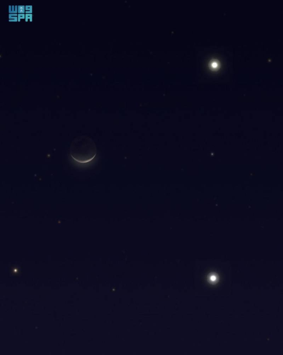 وأشار إلى أن هلال القمر سيكون في طور التناقص بعمر (26.3) يومًا مضيئًا بنسبة (11%) فقط من سطحه، ليكوّن مع كوكبي الزهرة والمشتري مثلثًا متناغمًا في السماء، حيث يظهر كوكب الزهرة كألمع نقطة ضوء يليه كوكب المشتري، فيما يُكمل النجمان كاستور وبولوكس المشهد السماوي على يسار القمر.