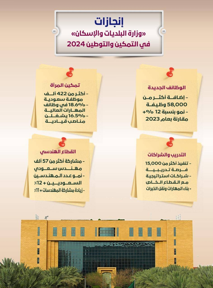 The Ministry of Municipal and Rural Affairs and Housing has contributed in 2024 to achieving a qualitative leap in developing human capabilities and localization in the economic activities and professions overseen by the ministry, with notable achievements in empowering women and enhancing effective partnerships, alongside significant growth in the engineering sector. These achievements are part of the ministry's efforts to establish the presence of Saudis in the municipal and housing sector and to strengthen an economy based on national competencies.