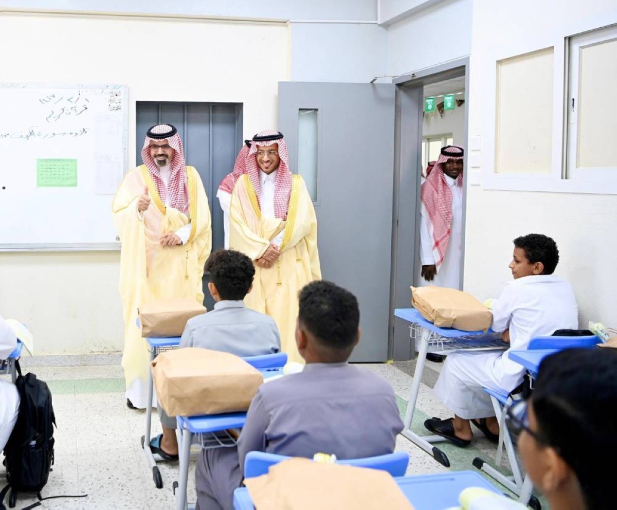 The Deputy Emir of Jazan, Prince Nasser bin Muhammad bin Abdullah bin Jalawi, witnessed the start of the new school year at the schools of the General Administration of Education in the region during his visit to King Abdulaziz Primary School and Al-Andalus Intermediate School in Jazan. During the visit, he reviewed the schools' preparations to welcome students and what the education administration has prepared in terms of programs and activities to ensure a serious and disciplined start to the school year. He also inspected the educational process inside classrooms and ensured the readiness of facilities and educational services. He emphasized the importance of preparing the school environment and providing all requirements that ensure the success of the school year, appreciating the efforts of teachers in fulfilling their noble mission and the role of parents in following up on their sons and daughters and enhancing their discipline.