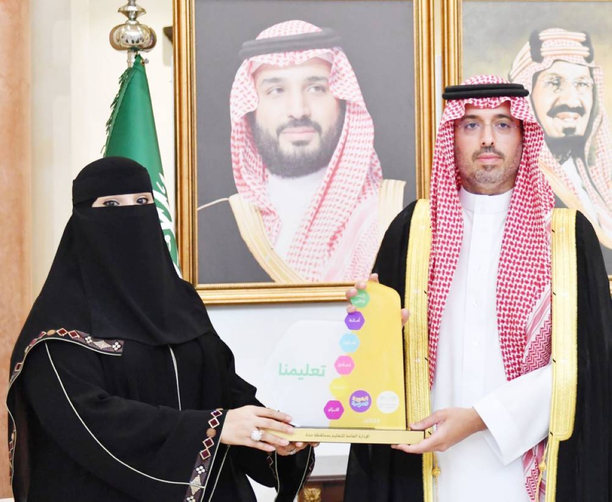 Jeddah Governor Prince Saud bin Abdullah bin Jalawi received the Director General of Education in Jeddah Governorate, Manal bint Mubarak Al-Luhaibi, along with the educational leaders of Jeddah at the governorate's headquarters.