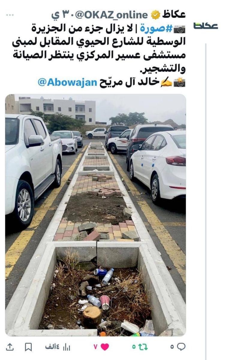 In response to what was published by "Okaz", the Asir Municipality carried out maintenance work and removed visual distortions in the central island opposite Asir Central Hospital as part of the requirements for preparing the airstrip, ensuring it is free of obstacles to achieve the highest safety standards during emergencies, while also improving the site to align with the urban landscape.
