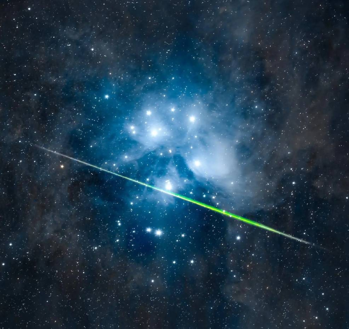 ووثقت الصورة وهجاً أخضر لشهاب يخترق عنقود «الثريا» النجمي في لقطة تعريض ضوئي استمرّت لمدة ساعة، في مشهد يرسّخ مكانة العُلا بصفتها وجهة عالمية لرصد النجوم والتصوير الفلكي.