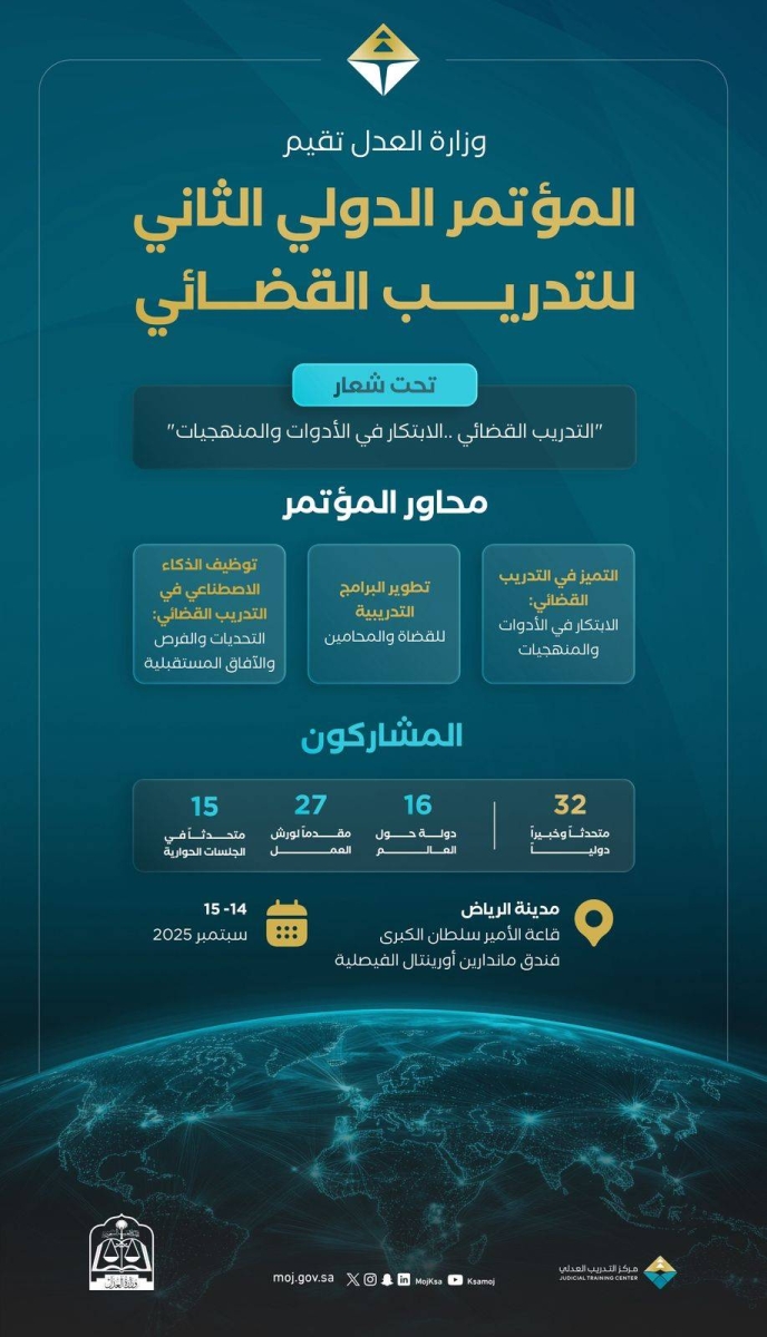 The Ministry of Justice, represented by the Judicial Training Center, announced the second international conference on judicial training to be held from September 14 to 15 in Riyadh, under the slogan: “Judicial Training.. Innovation in Tools and Methodologies.”