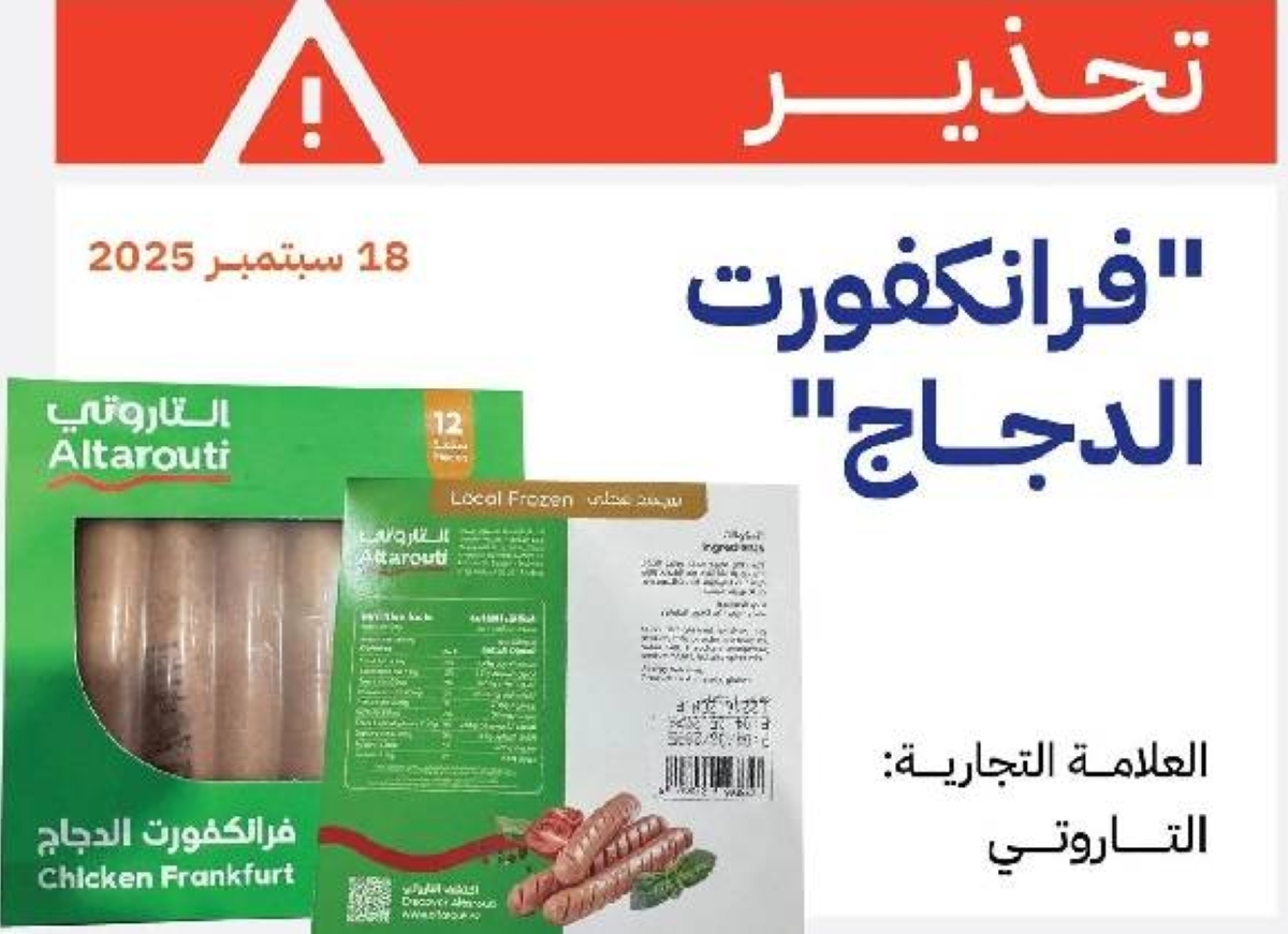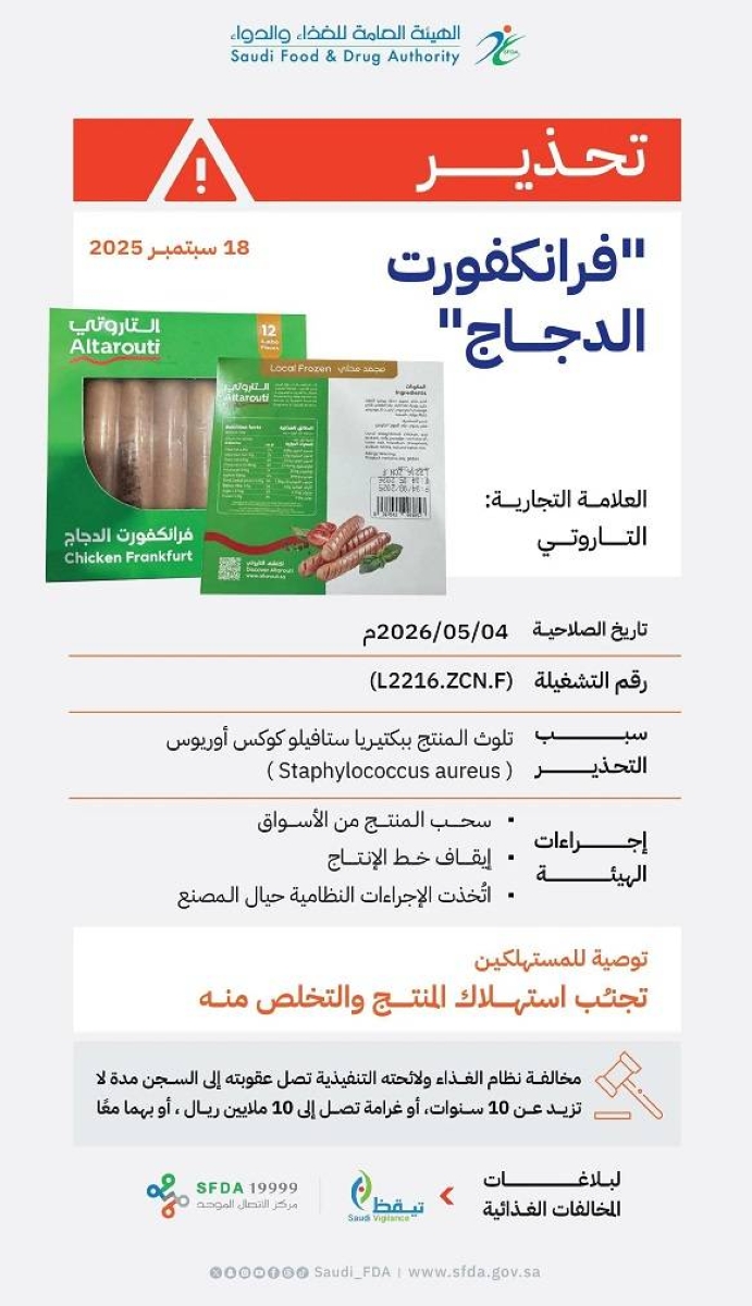 The Saudi Food and Drug Authority issued a warning regarding the product "Chicken Frankfurt" from the brand (Al-Tarouti) manufactured in the Kingdom, packaged in containers of (12) pieces, with an expiration date until 04 / 05 / 2026, and batch number (L2216.ZCN.F). It clarified that laboratory analysis results confirmed the contamination of the product with Staphylococcus aureus bacteria, which may pose a risk to consumer health.