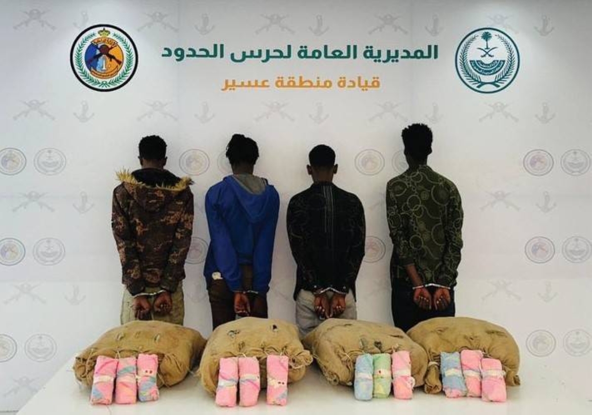 The border patrols of the Border Guard in the Al-Rabou'a sector of the Asir region arrested 4 violators of the border security system of Ethiopian nationality for smuggling 80 kilograms of the narcotic plant khat. The initial legal procedures against them were completed, and they, along with the seized items, were handed over to the relevant authorities.