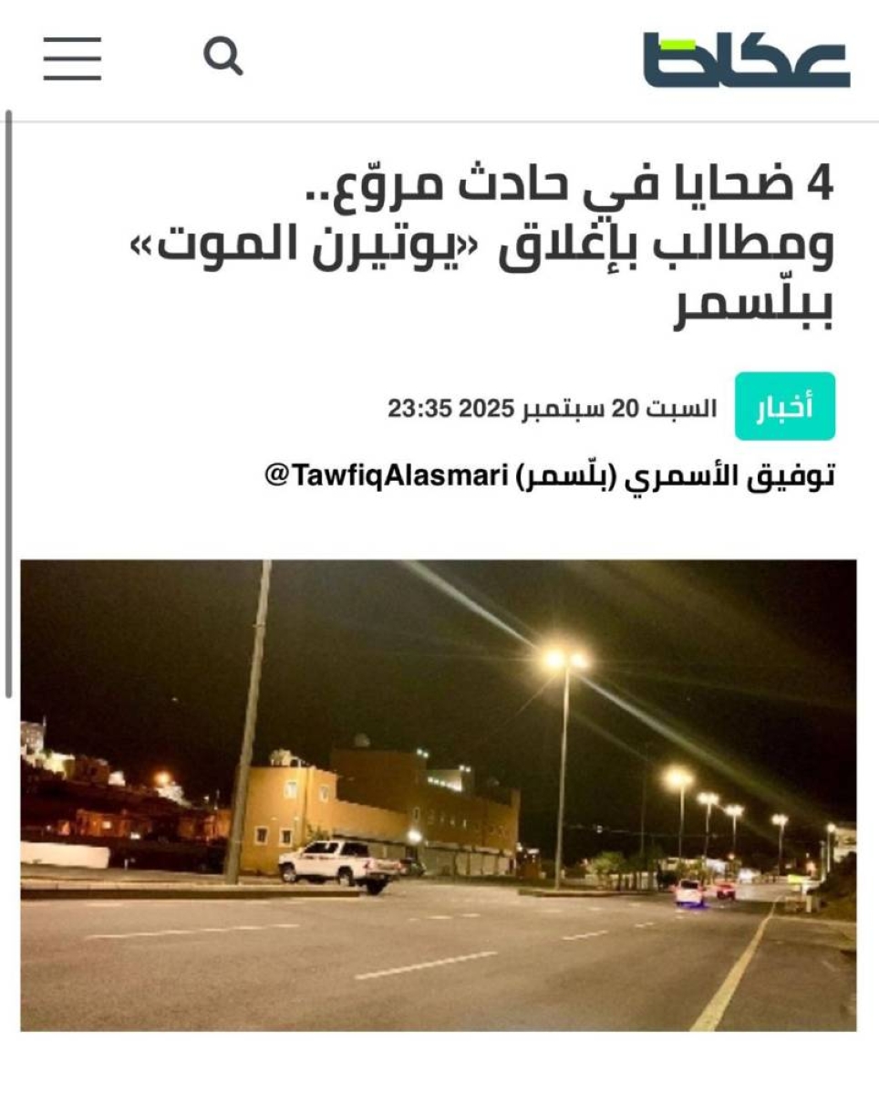 The news report published by "Okaz" highlighted the danger of choosing the "U-turn" location at a hazardous curve, which increases the likelihood of accidents. This prompted urgent calls from the residents for appropriate engineering solutions.