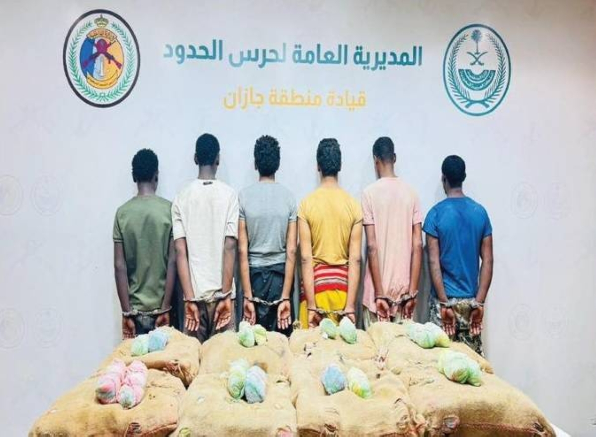The border patrols of the Border Guard in the Al-Dayer sector of the Jazan region apprehended (6) violators of the border security system from Yemeni and Ethiopian nationalities for smuggling (200) kilograms of the narcotic plant khat. The initial legal procedures against them were completed, and they along with the seized items were handed over to the relevant authorities.