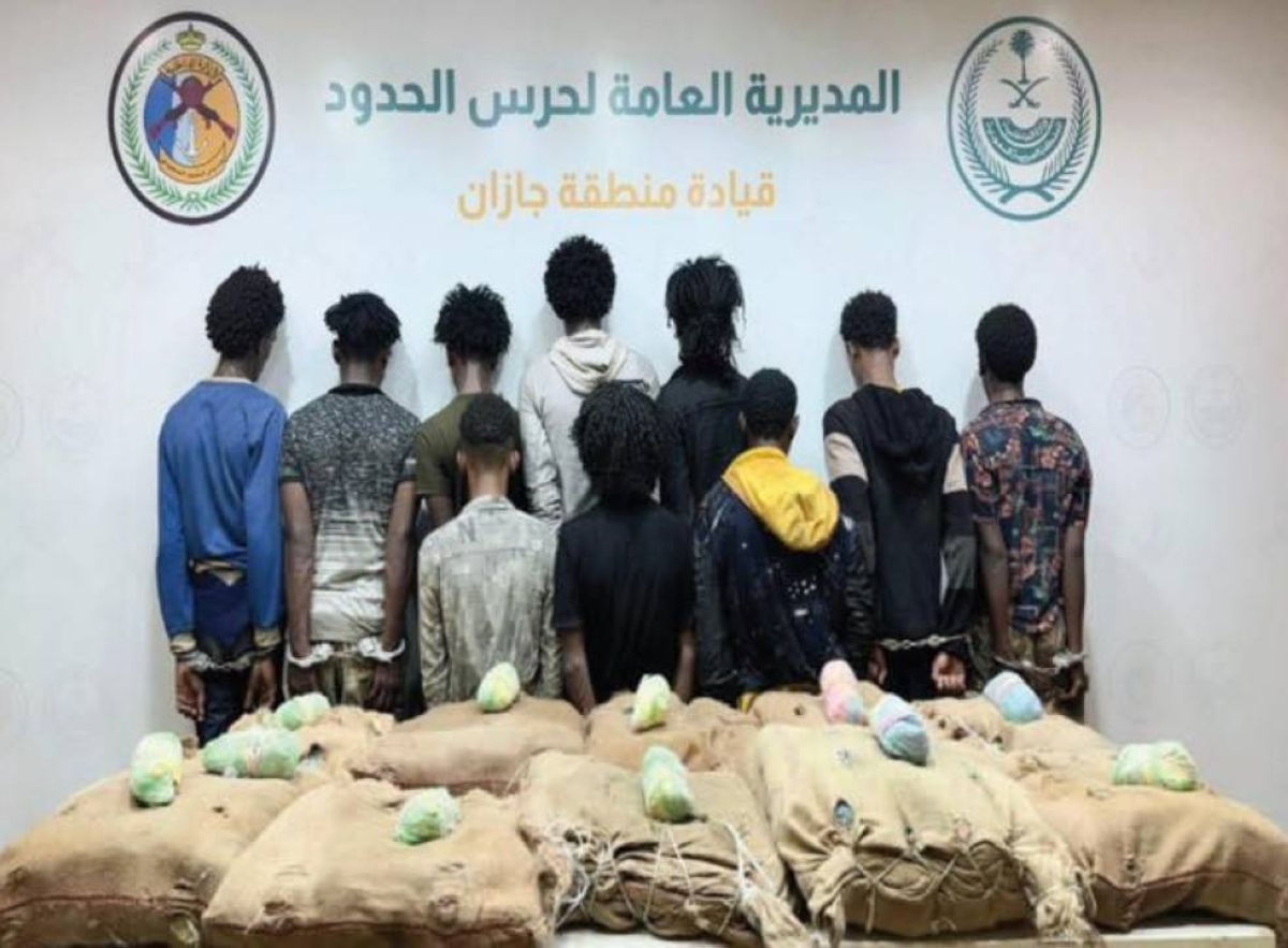 The border patrols of the Border Guard in the Al-Dayer sector of the Jazan region apprehended (10) violators of the border security system of Ethiopian nationality for smuggling (200) kilograms of the narcotic plant khat. The initial legal procedures against them were completed, and they along with the confiscated items were handed over to the relevant authorities.