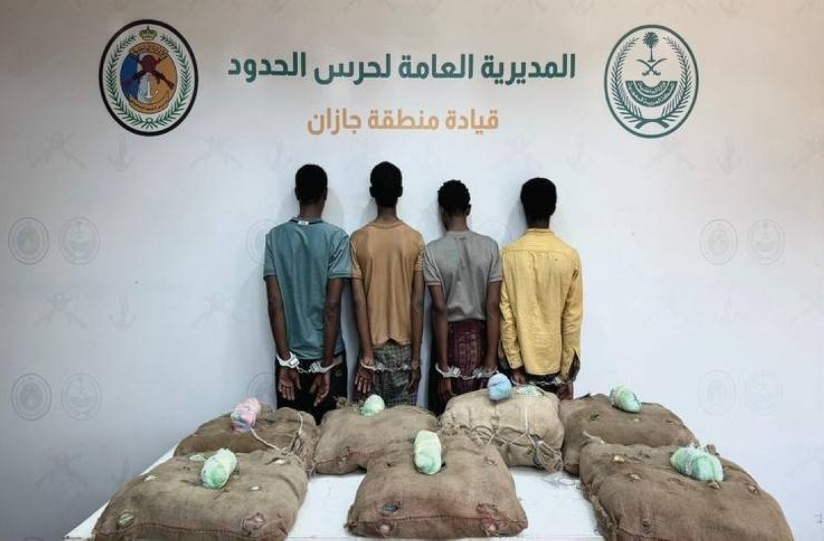 The border patrols of the Border Guard in the Al-Dayer sector of the Jazan region apprehended (4) violators of the border security system of Ethiopian nationality for smuggling (140) kilograms of the narcotic plant khat. The initial legal procedures against them were completed, and they along with the confiscated items were handed over to the relevant authorities.