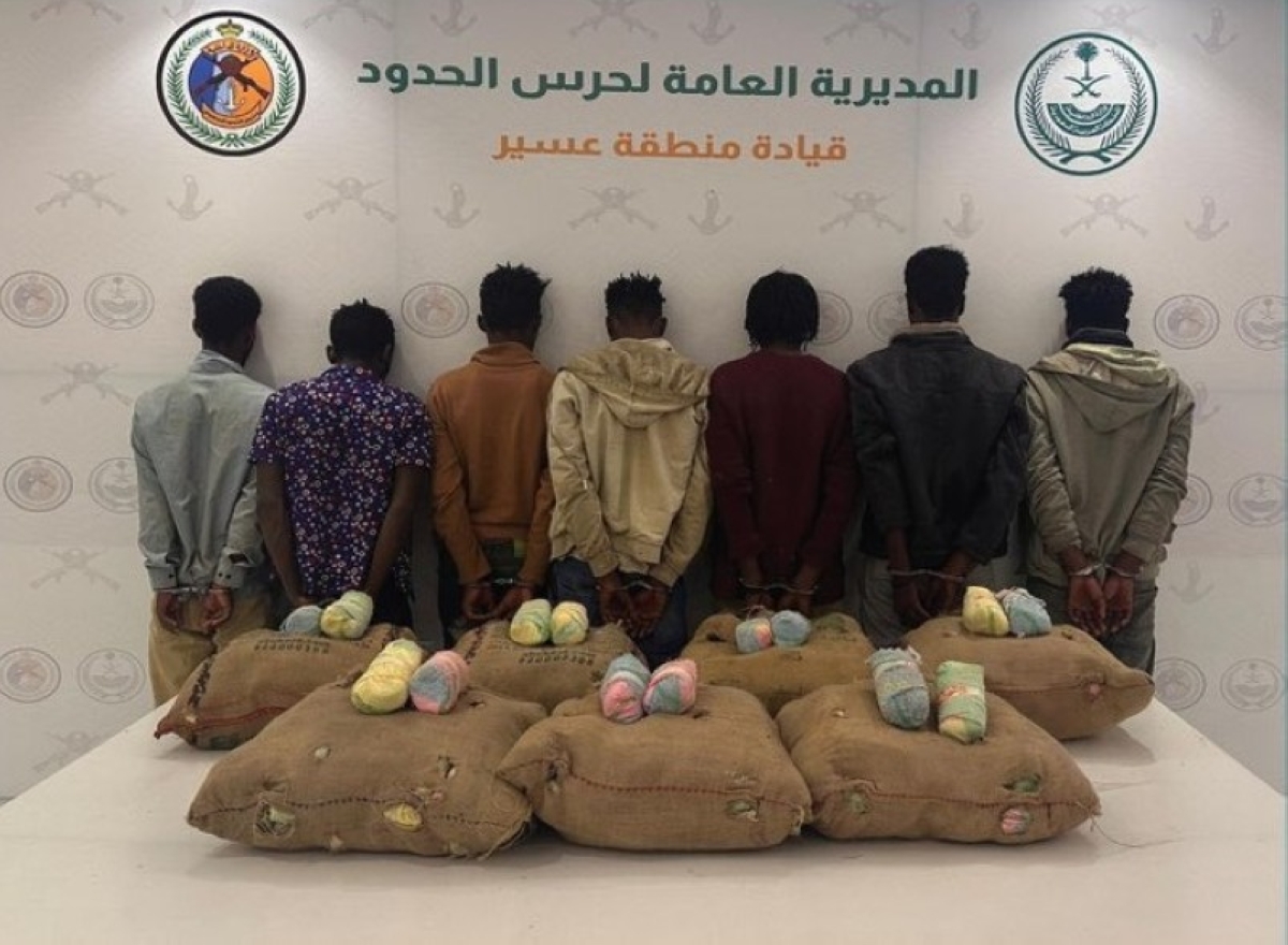 The border patrols of the Border Guard in the Al-Rubou'a sector of the Asir region arrested (7) violators of the border security system of Ethiopian nationality for smuggling (120) kilograms of the narcotic plant khat. The initial legal procedures against them were completed, and they along with the seized items were handed over to the relevant authority.