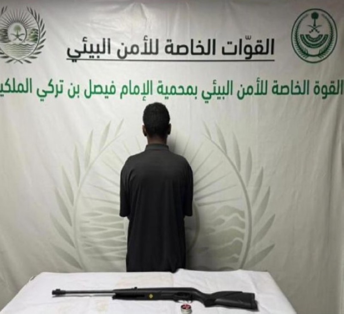 تمكنت القوات الخاصة للأمن البيئي وهي تؤدي مهماتها في تنفيذ نظام البيئة من ضبط مواطن مخالف لنظام البيئة؛ لارتكابه مخالفة الشروع في الصيد دون ترخيص في محمية الإمام فيصل بن تركي الملكية، بحوزته بندقية هوائية و(250) ذخيرة هوائية، وطبقت الإجراءات النظامية بحقه.