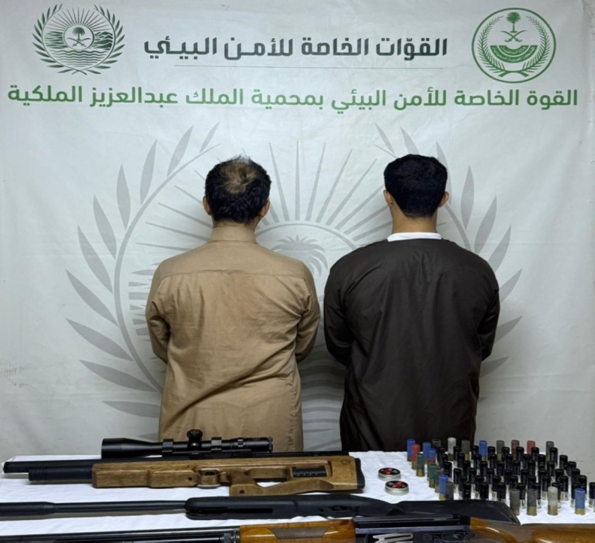The special forces for environmental security, while carrying out their duties in enforcing the environmental system, managed to apprehend citizens violating the environmental system for attempting to hunt without a license in the King Abdulaziz Royal Reserve, in possession of a shotgun and two air rifles along with (572) assorted ammunition. Legal procedures were applied against them.