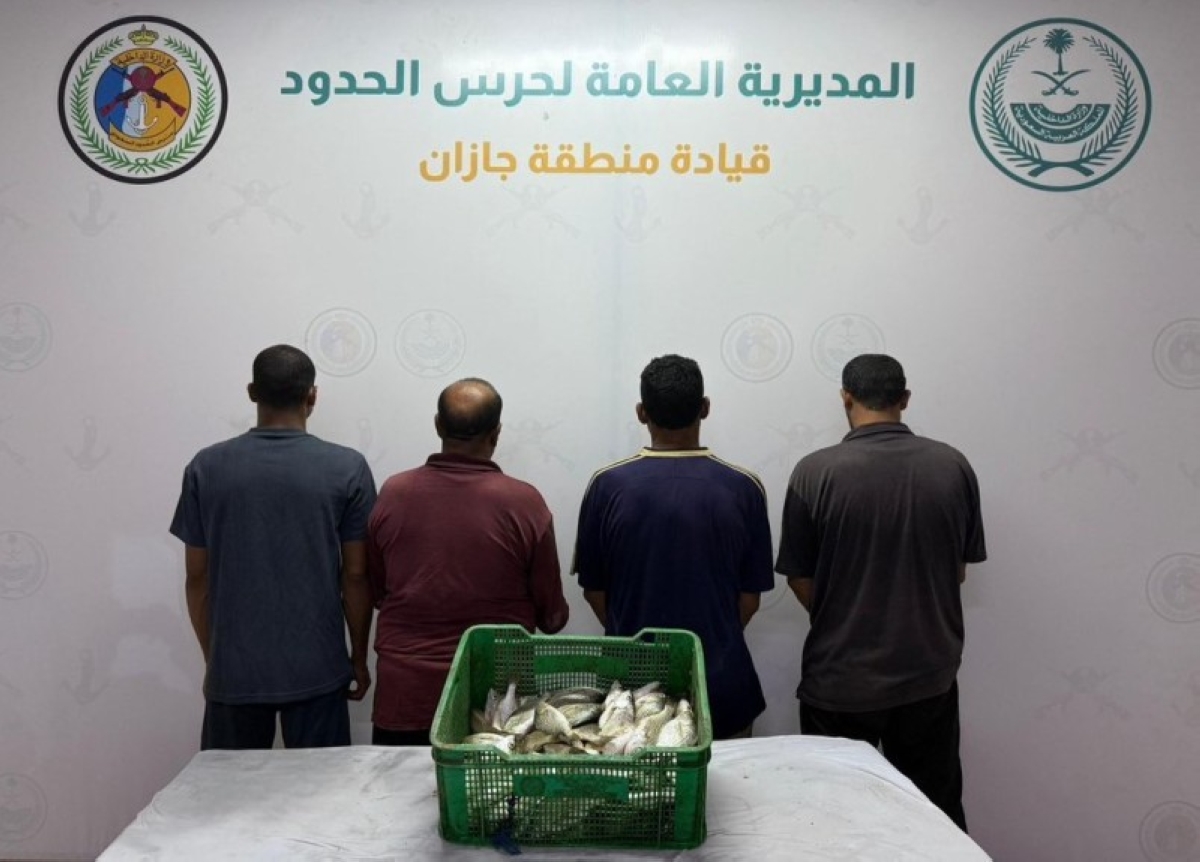 The coastal patrols of the Border Guard in the Bisha Governorate of the Jazan region apprehended (4) residents of Egyptian nationality who were violating the security and safety regulations for practicing marine activities in the maritime areas of the Kingdom of Saudi Arabia. They were caught fishing without a permit in a prohibited area, and they were in possession of caught fish. Legal actions were taken against them in coordination with the relevant authorities.