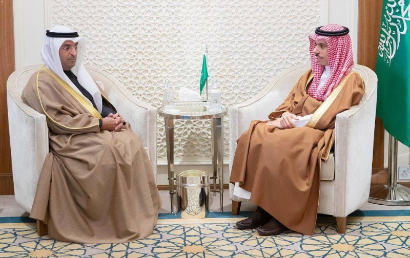 الأمير فيصل بن فرحان مستقبلا الأمين العام الجديد لمجلس التعاون.