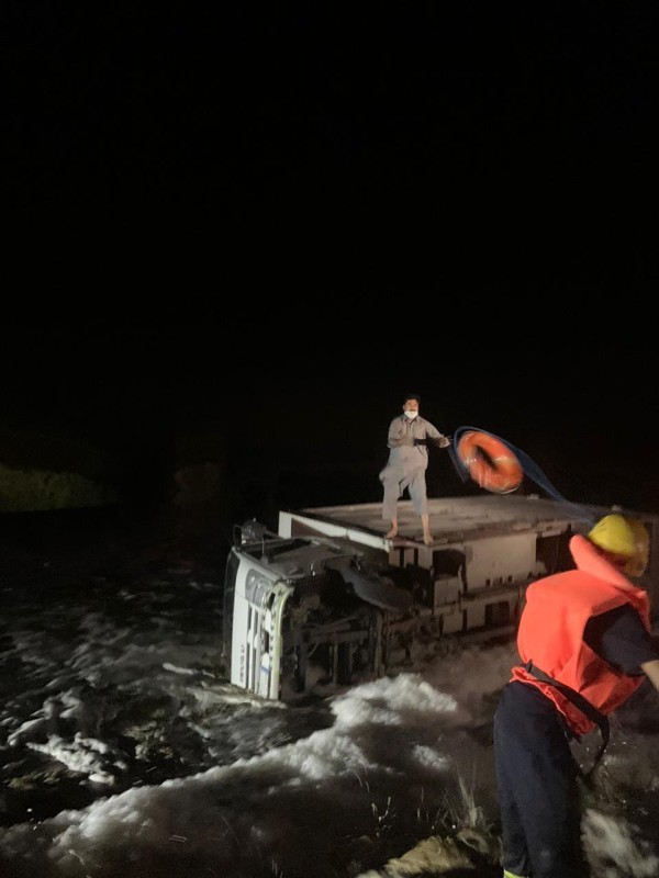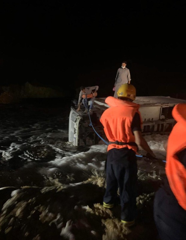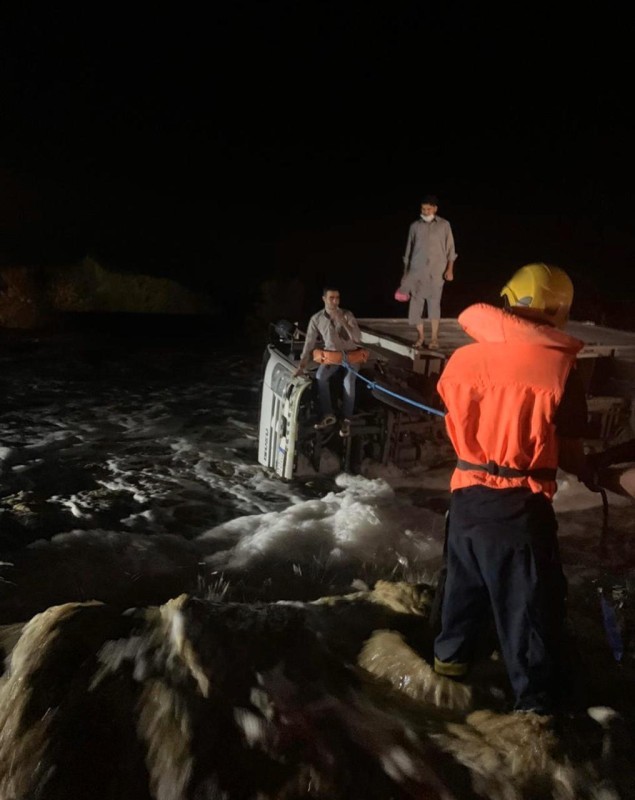 وعلى الفور جرى تحريك الفرق اللازمة والمهمات وفق خطة الأمطار، وبوصول الفرق للموقع اتضح أن الحالة عبارة عن احتجاز شخصين بسيارة نقل (دينا) مقلوبة في مجرى السيل حيث تم التعامل مع الحالة بشكل فوري وإنقاذهما باستخدام حبال الإنقاذ وأطواق النجاة، أحدهما من الجنسية العربية بالعقد الثالث من عمره والآخر من الجنسية الآسيوية بالعقد الثالث من عمره وهما بصحة جيدة ولله الحمد.
