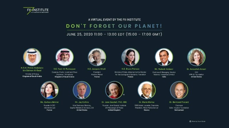 وقال محافظ صندوق الاستثمارات العامة السعودي ورئيس مجلس إدارة مؤسسة مبادرة مستقبل الاستثمار، ياسر بن عثمان الرميان: «لا مخرج من حالة الركود الاقتصادي الراهنة إلا في إعادة التفكير في وضع كوكبنا ومعاودة التواصل معه، سواءً كنا أفراداً أو شركات أو مستثمرين. إن وجود خطة عالمية مستدامة تشمل البيئة للتعافي من الأزمة ستخلق فرص عمل وتطور البنية التحتية وتحقق عوائد مالية». ويجمع هذا المؤتمر الافتراضي نخبة من الخبراء في مجال البيئة والخدمات المالية من جميع أنحاء العالم لمناقشة الحلول البيئية وفرص الاستثمار وخطط التعافي، بما يتماشى مع بنود اتفاق باريس وأهداف الأمم المتحدة للتنمية المستدامة. ويمكن مشاهدة أبرز جوانب هذا الحدث هنا. وتشمل قائمة المتحدثين:الأمير عبد العزيز بن سلمان آل سعود، وزير الطاقة بالمملكة العربية السعودية، و ياسر بن عثمان الرميان، محافظ صندوق الاستثمارات العامة ورئيس مجلس إدارة مؤسسة مبادرة مستقبل الاستثمار، و برون بوارسون، وزيرة الدولة للانتقال البيئي والتضامن، فرنس، والسيد جاكيه أتالي، رئيس بوزيتيف بلانيت، فرنسا، والسيد موكيش أمباني، رئيس مجلس الإدارة والمدير الإداري في شركة ريلاينس إندستريز، الهند، والسيدة أنوشة أنصاري، الرئيس التنفيذي لمؤسسة إكس برايز، الولايات المتحدة الأمريكية، والسيدة باربارا بيلفيسي، المؤسسة والرئيس التنفيذي في إنترستيلار لاب، فرنسا، والسيد جاي كولينز، نائب رئيس مجلس الإدارة للشؤون المصرفية واستشارات أسواق المال في مجموعة سيتي، الولايات المتحدة الأمريكية، و الدكتور جين غودول، مؤسسة معهد جين غودول، وسفيرة الأمم المتحدة للسلام، المملكة المتحدة، والسيدة ماريان هار، المدير التنفيذي لتحالف غرين ديجيتال فاينانس، الدنمارك، والدكتور ماريو مولينا، الحائز على جائزة نوبل في الكيمياء للعام 1995 ورئيس مركز ماريو مولينا، المكسيك، والدكتور برتراند بيكارد، رئيس مؤسسة سولار إمبلص، سويسرا، والسيد باتريك بويان، رئيس مجلس الإدارة والرئيس التنفيذي في شركة توتال، فرنسا، واللورد أداير ترنر، رئيس لجنة تحولات الطاقة وكبير زملاء معهد الفكر الاقتصادي الجديد، المملكة المتحدة