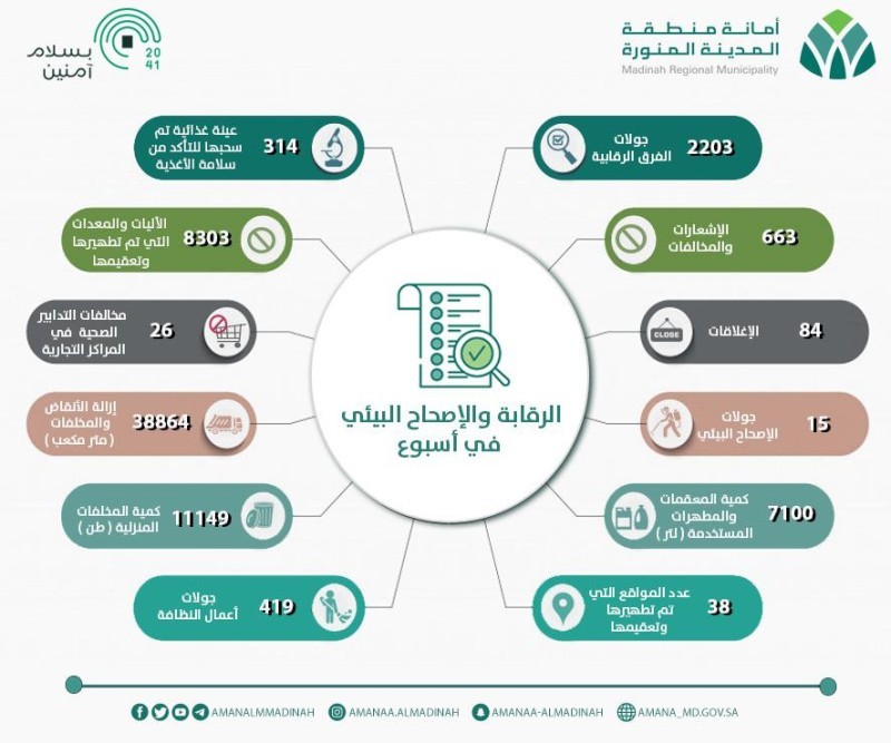 أغلقت أمانة منطقة المدينة المنورة 84 منشأة مخالفة، وحررت 663 إشعارا ومخالفة، من بينها 26 مخالفة للتدابير الصحية في المراكز التجارية، وذلك خلال 2203 جولات ميدانية نفذتها الأسبوع الماضي للتأكد من تطبيق الاشتراطات الصحية والتقيد بالإجراءات الوقائية والاحترازية.