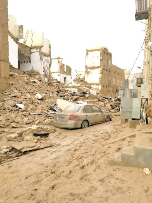 سيارات وأنقاض مبان دمرتها الفيضانات في تريم.