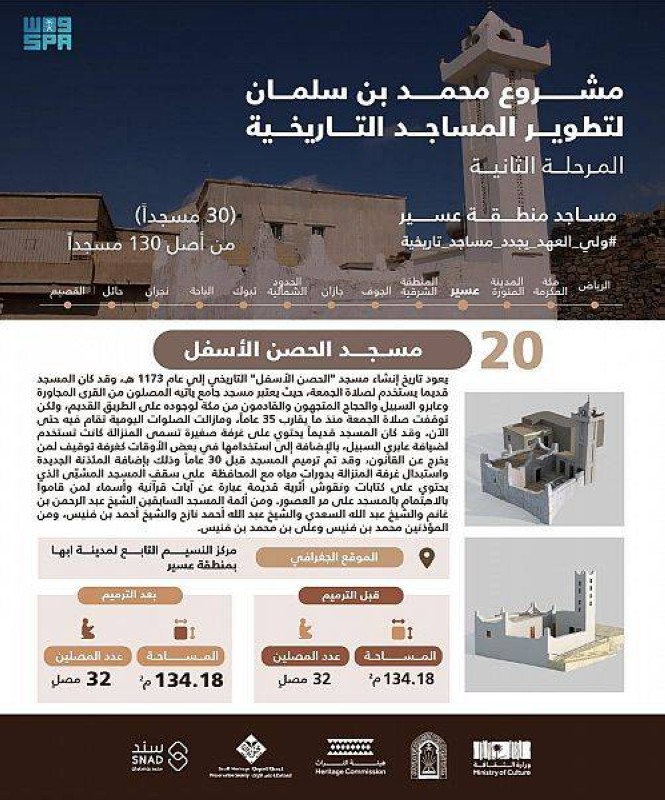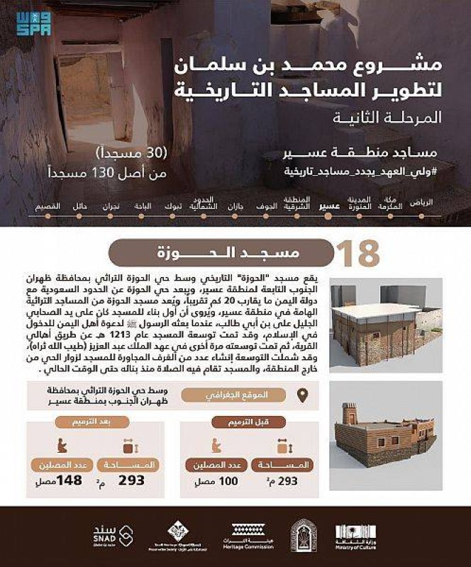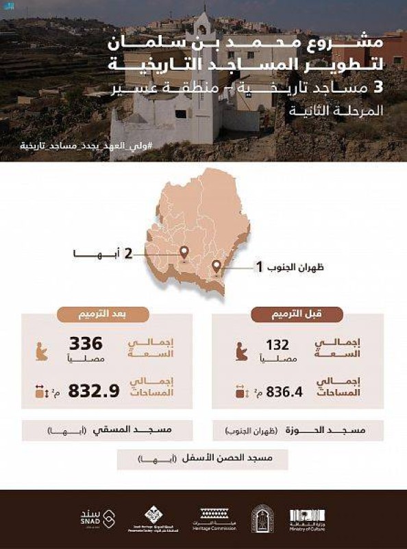 انطلاقاً من المكانة العظيمة للمساجد التاريخية في الدين الإسلامي، والتأكيد على أهميتها وعمقها الديني والتاريخي والثقافي والاجتماعي والمعماري الذي تتميز به تسهم المرحلة الثانية لمشروع الأمير محمد بن سلمان لتطوير المساجد التاريخية في الحفاظ على الخصائص التاريخية لمساجد منطقة عسير.