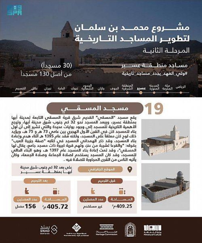 وفي شرق قرية المسقي الواقعة جنوب شرق مدينة أبها بنحو 32 كم يستهدف التطوير مسجد المسقي القديم الذي بُني في أول قرن هجري، بين عامي 73-75هـ، وكان تاريخ بنائه موثقاً في لوح معلق عليه، قبل أن يُفقد في أعمال إعادة بناء المسجد في عام 1395هـ.