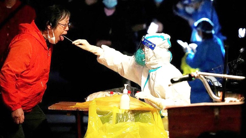 كادر صحي يرتدي زي الحماية الواقي أثناء أخذ عينة من مواطنة صينية في شنغهاي. (وكالات)