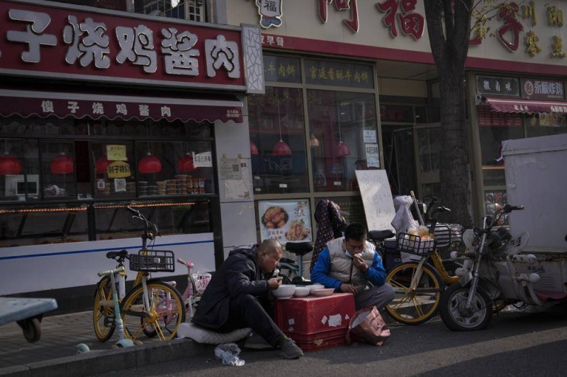 صينيون يتناولون غداءهم أمام مطعم مغلق في أحد أحياء بكين أمس (الأربعاء). (وكالات)