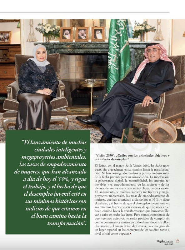 وأشار إلى أن الرؤية أطلقت العديد من المدن الذكية والمشاريع البيئية الضخمة، وزادت من معدلات تمكين المرأة، الذي وصل إلى 33% اليوم، وساهمت في تدني مستوى بطالة الشباب ما يؤكد بأن المملكة في طريقها للتحول الذي تبحث عنه، وأن الأهداف سيتم بلوغها من خلال التعاون مع الأصدقاء حول العالم، ومن ذلك مملكة إسبانيا التي تتمتع بمكانة خاصة في قلوب السعوديين، رسميا وشعبيا.