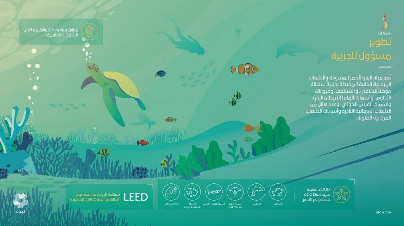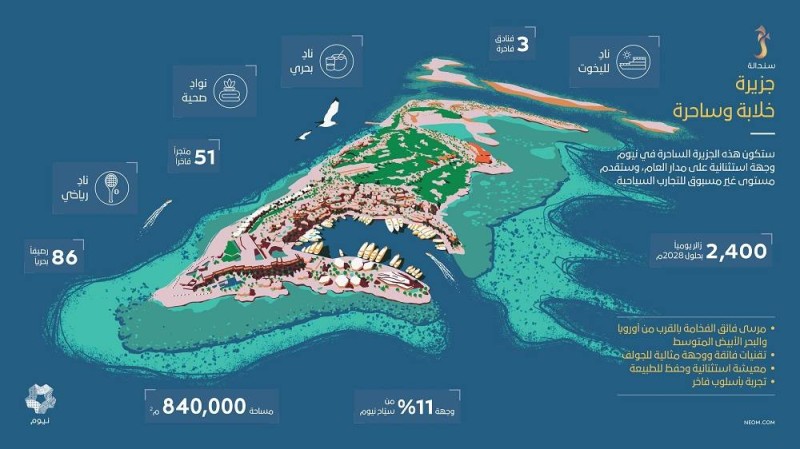 وستعمل نيوم على تحقيق هذه التطلعات بالتعاون مع العلامات التجارية العالمية في قطاعي الترفيه والفنادق لتطوير الجزيرة وجعلها وجهة حصرية وساحرة في البحر الأحمر لمجتمع اليخوت في العالم، محاطة ببيئتها البحرية الخلابة والمتنوعة التي تضم واحدة من أجمل محميات الشعاب المرجانية في العالم.